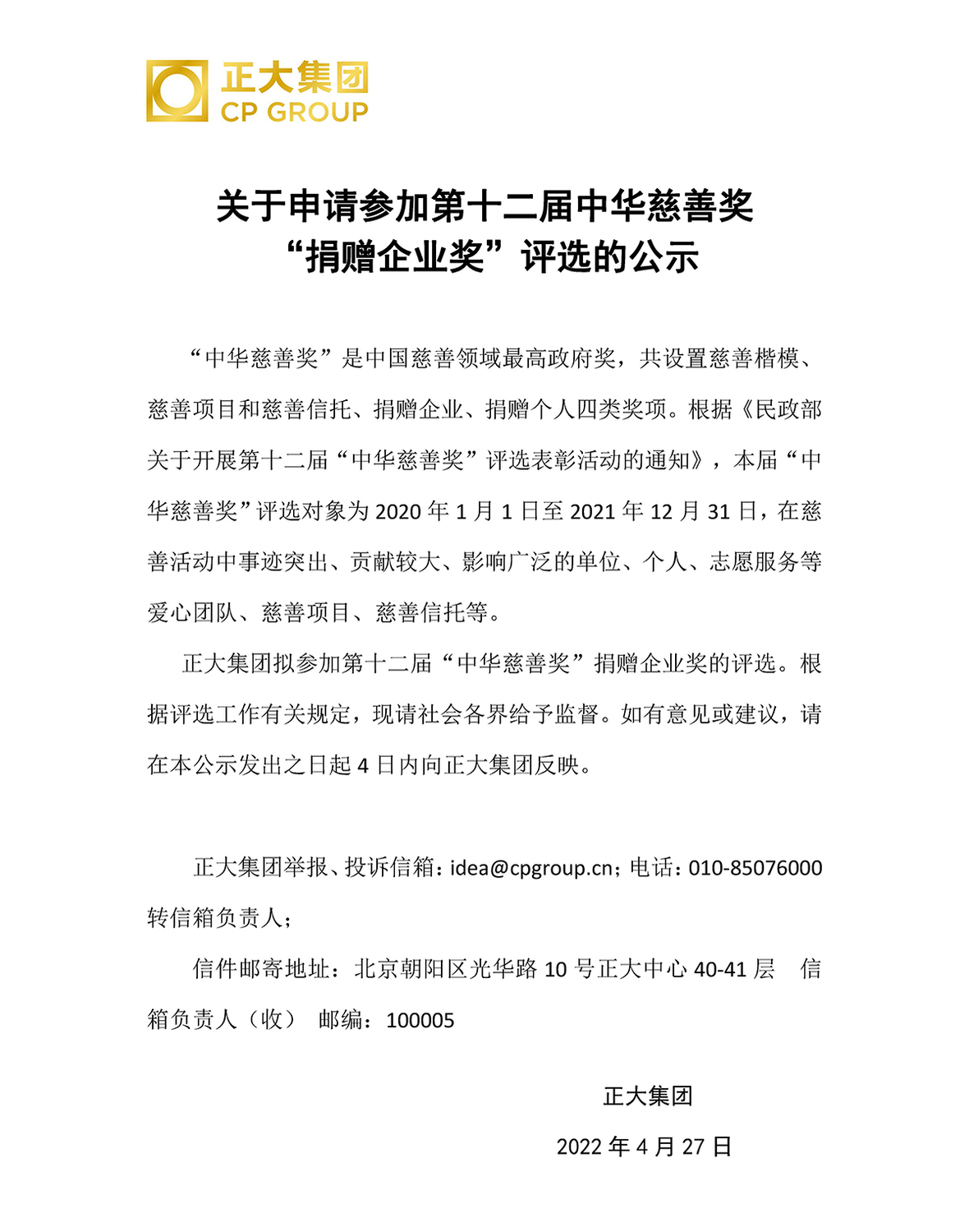關於申請參加第十二屆中華慈善獎“捐贈企業獎”評選的公示