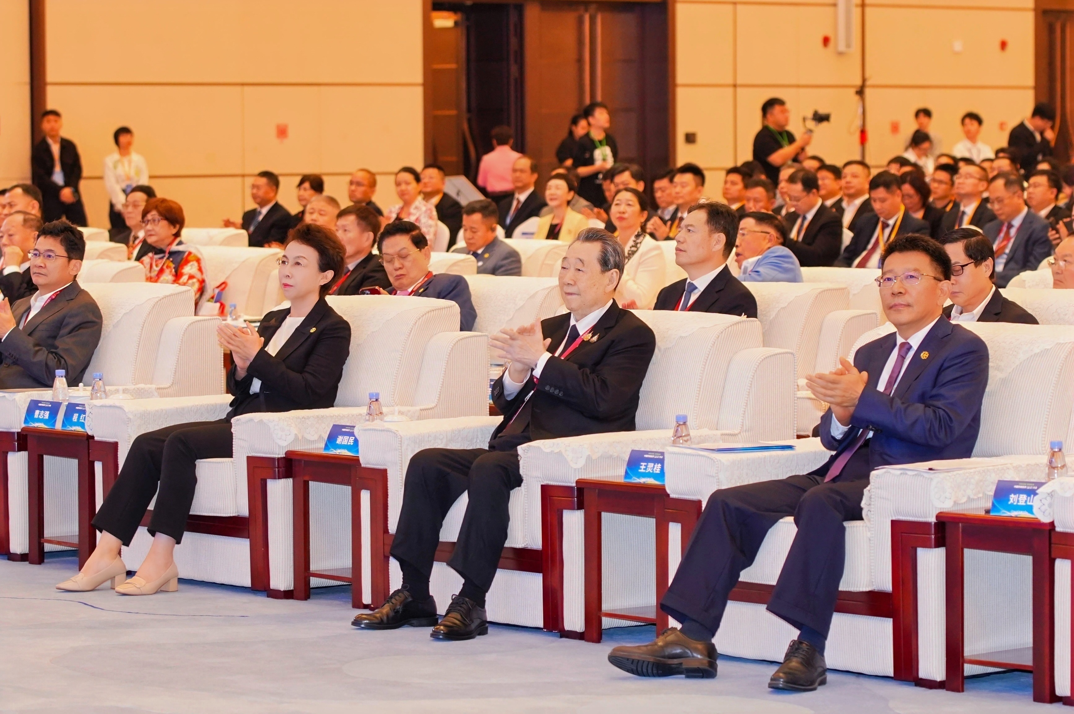 ▲中國僑聯黨組書記、主席王靈桂(右一),中國僑聯副主席程紅(右三)和謝國民集團資深董事長(右二)在中國僑商投資(海南)大會開幕式現場。