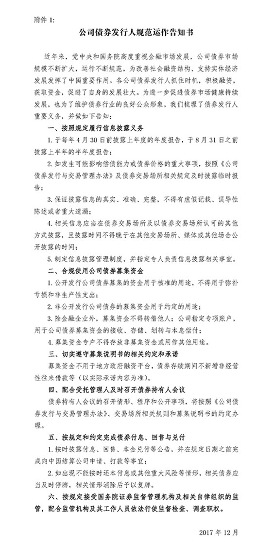 《通知》要求,各公司債券發行人應通過公司官網、微信公眾號上掛《公司債券發行人規範運作告知書》。