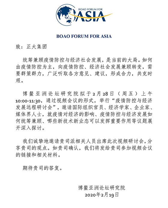 博鼇亞洲論壇研究院舉行“疫情防控與經濟發展”遠程研討會 正大集團謝毅應邀出席並發言