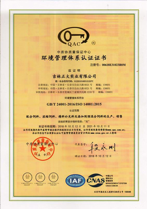 為實現節能減排,降低成本,提高公司管理水平,今年5月,吉林正大實業有限公司決定在全公司範圍內開展ISO14001環境管理體係認證工作,同時,將已經建立並實施的ISO9001質量管理體係、ISO22000食品安全管理體係和ISO14001:2015環境體係進行整合,建立三標一體化高效的質量、環境和食品安全管理體係。經過公司全體人員五個多月的努力,吉林正大實業有限公司順利通過了中質協質量保證中心(QAC)認證監督審核,並於10月18日獲得了GB/T 24001-2016/ISO14001:2015環境管理體係認證證書。