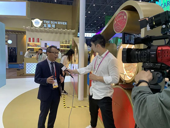 5月7日,藍曉資深總裁(左一)在正大展館接受央視記者采訪。