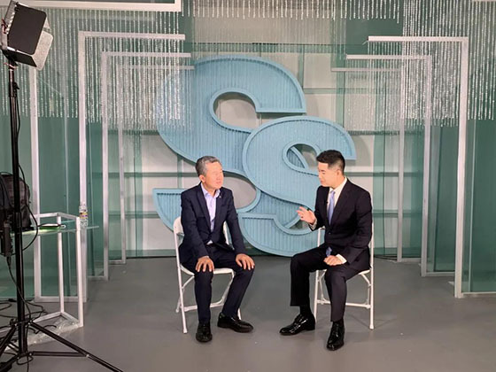 5月7日,趙金龍資深總裁(右一)在正大展館接受央視新聞記者直播專訪,直播在百度、今日頭條、快手平台播出。