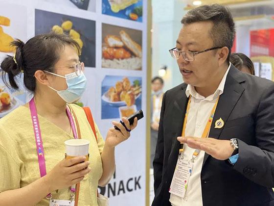 5月8日,藍曉資深總裁(右一)在正大展館接受中國食品報記者采訪。
