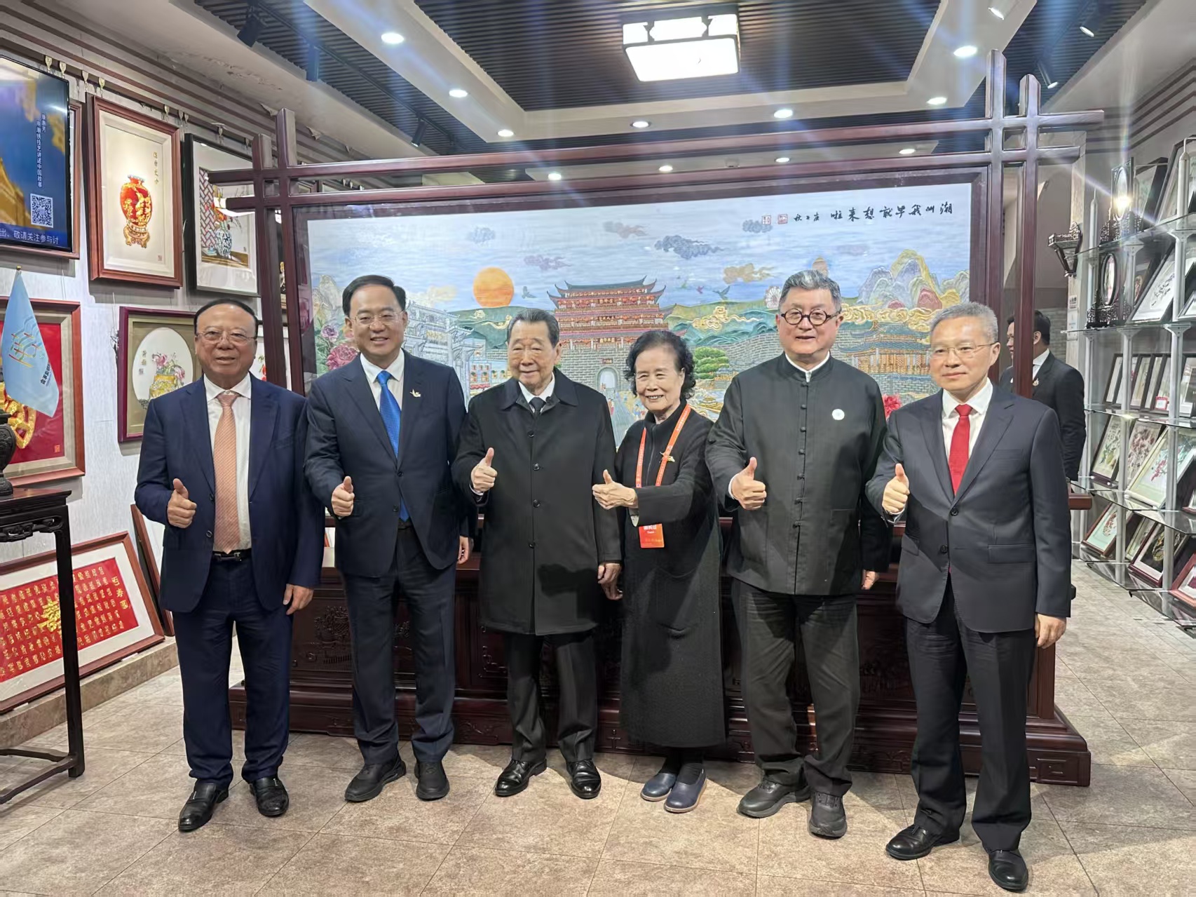 ▲潮州市委書記何曉軍(左二)與謝國民集團資深董事長(左三)在潮繡藝術博物館合影留念。潮州市委副書記、市長劉勝(右一),深圳市潮汕商會常務副會長佘桂錫(左一),潮繡大師康惠芳(右三),正大集團副總裁李聞海(右二)一同合影。