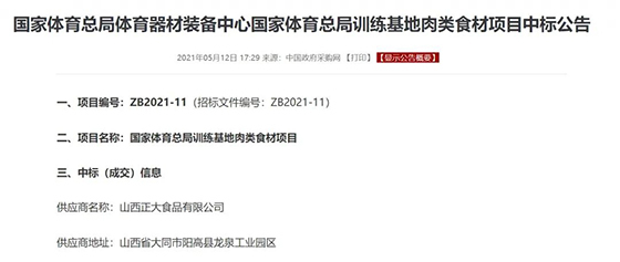 5月12日,中國政府采購網發布了《國家體育總局體育器材裝備中心國家體育總局訓練基地肉類食材項目中標公告》,公(gong)告(gao)顯(xian)示(shi)山(shan)西(xi)正(zheng)大(da)食(shi)品(pin)有(you)限(xian)公(gong)司(si)成(cheng)為(wei)國(guo)家(jia)體(ti)育(yu)總(zong)局(ju)訓(xun)練(lian)基(ji)地(di)指(zhi)定(ding)食(shi)材(cai)供(gong)應(ying)商(shang),將(jiang)為(wei)國(guo)家(jia)體(ti)育(yu)總(zong)局(ju)訓(xun)練(lian)基(ji)地(di)國(guo)家(jia)隊(dui)運(yun)動(dong)員(yuan)提(ti)供(gong)備(bei)戰(zhan)保(bao)障(zhang)豬(zhu)肉(rou)食(shi)品(pin)。