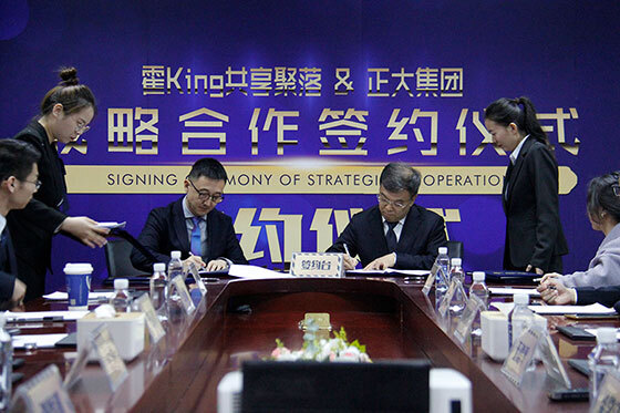 2019年4月2日下午,正大集團與霍King共享聚落戰略合作簽約儀式在紅星美凱龍北京北五環霍King共享聚落隆重舉行。正大集團農牧食品企業中國區資深副董事長於建平,霍King品牌發起人、紅星美凱龍集團總裁王偉出席簽約儀式,並代表雙方就自動售賣設備投放、標準化餐廳打造等項目簽署戰略合作協議。