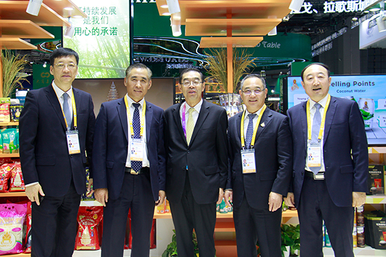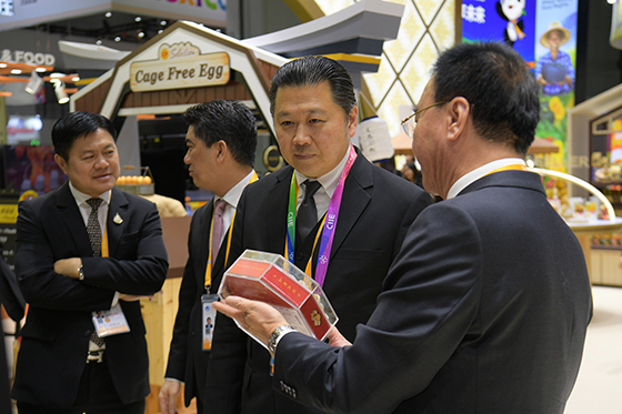 ▲CPF執行委員會副主席K.Sukhawat(中)與正大集團農牧食品企業中國區資深副董事長於建平(左)、周永順(右)在泰阿裏Thai Aree展台前合影