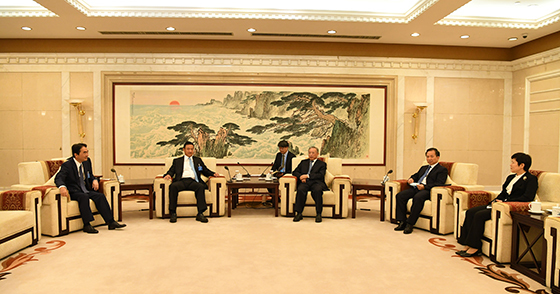 劉家義書記(右三),山東省委副書記、省長李幹傑(右二),山東省副省長任愛榮(右一)會見楊小平CEO(左二)及福田祐士副社長(左一)。