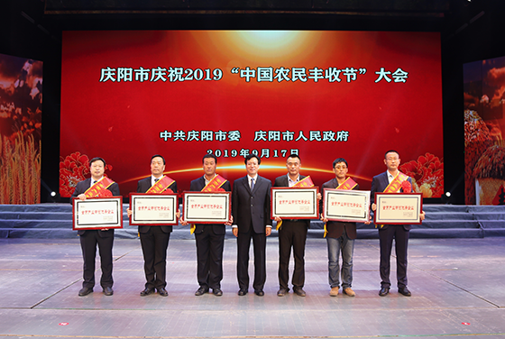 當晚,慶陽市慶祝“2019中國農民豐收節”晚會在慶陽大劇院精彩上演。正大集團農牧食品企業中國區馬繼林副董事長受邀出席了晚會。晚會伊始,省政協副主席、慶陽市委書記貟建民致辭。隨後,慶陽市委副書記盧小亨宣讀表彰獎勵決定,對全市各地湧現出的產業致富帶頭人、產業帶貧優秀企業等進行了表彰。蘭州正大以其 “331+”合作社帶動貧困群眾參與產業鏈條開發,實現抱團發展的有效脫貧模式獲得“產業帶貧優秀企業”獎。正大集團農牧食品企業甘寧區李琳興資深副總裁上台領獎,貟建民副主席為其頒獎。