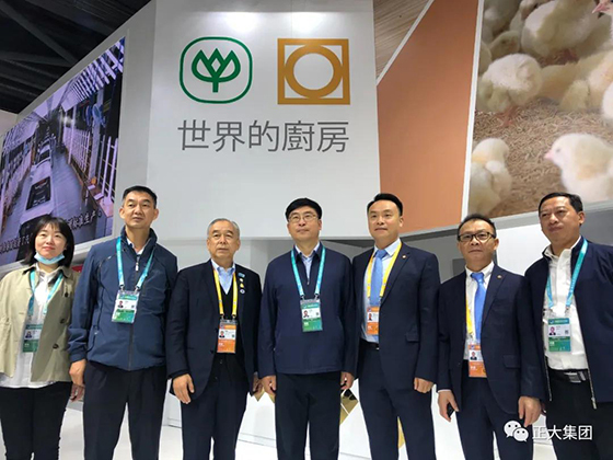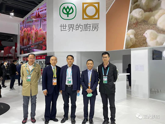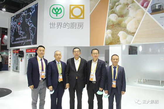 11月7日,正大集團資深執行副總裁、農牧食品企業和零售事業中國區資深副董事長謝毅(中)在正大展館接待嘉賓和指導工作時,與農牧食品企業中國區薛增一副董事長(左二)、葉劍副董事長(左一)、北京總部貿易部藍曉資深總裁(右一)、北京總部市場部張曙暉資深總裁(右二)合影留念。