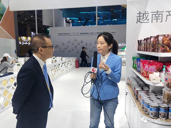11月9日,東方衛視記者在正大展館采訪葉劍副董事長、藍曉資深總裁。圖為藍曉資深總裁向記者介紹正大展館情況。