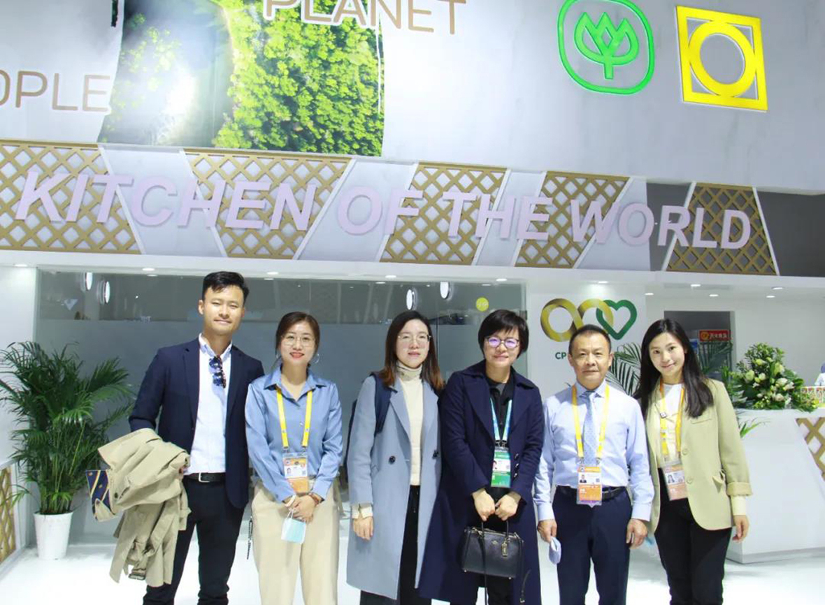 11月10日,卜蜂(中國)生物科技有限公司首席運營長謝百姓(左四)一行與薛增一副董事長(左三)、葉劍副董事長(左二)、藍曉資深總裁(右二)等在正大展館合影。