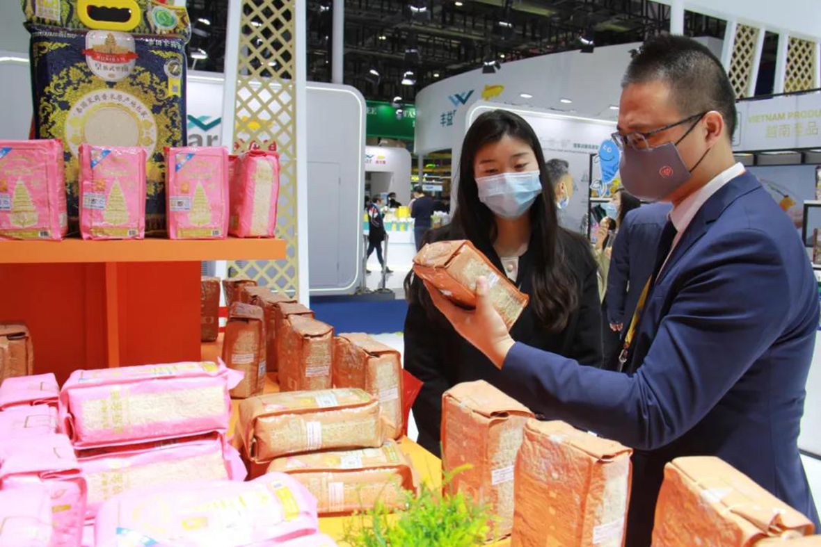 11月8日,上海市委統戰部副部長、市僑聯黨組書記、市僑辦主任王玨(左二)參觀正大展館,郝鵬飛集團新事業發展副總裁(左三)、藍曉北京總部貿易部資深總裁(左四)等介紹正大泰國茉莉香糙米產品。