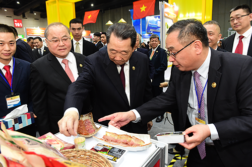 ▲謝國民資深董事長品嚐中國區展位的鮮美食品。