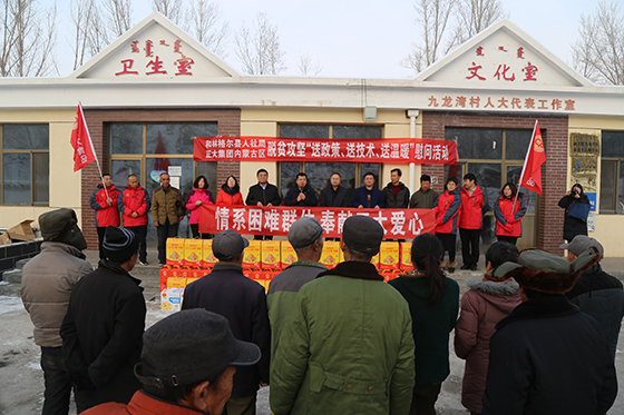 2019年12月18日,和林格爾縣人社局聯合正大集團內蒙古區走進和林格爾縣城關鎮九龍灣村開展“送政策、送技術、送溫暖”活動。和林格爾縣人社局局長馬誌斌及全體幫扶幹部、城關鎮黨委書記趙立峰及九龍灣村委會班子成員、正大集團內蒙古區副總裁彭天泉一行8人參與慰問。