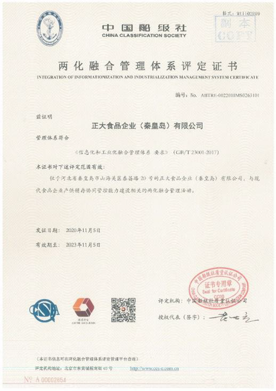2021年7月25日,正大食品企業(秦皇島)有限公司(以下簡稱CP秦皇島)順利通過兩化(信息化和工業化)融合管理體係(以下簡稱:兩化融合)監督審核,保持證書、貫標持續有效。