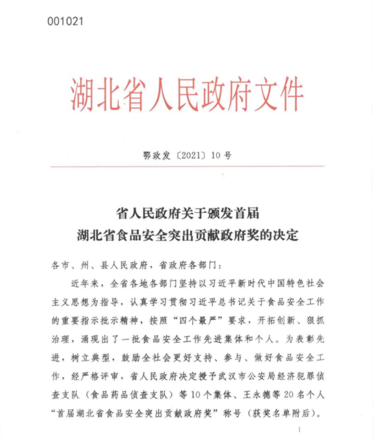 為貫徹習近平總書記關於食品安全工作的指示精神,落實“四個最嚴”要求,激勵全社會參與食品安全治理,2020年nian,經jing湖hu北bei省sheng政zheng府fu批pi準zhun,由you省sheng人ren社she廳ting和he省sheng市shi場chang監jian管guan局ju組zu織zhi實shi施shi首shou屆jie湖hu北bei省sheng食shi品pin安an全quan突tu出chu貢gong獻xian政zheng府fu獎jiang的de評ping選xuan活huo動dong。經jing過guo湖hu北bei省sheng評ping審shen專zhuan家jia組zu資zi料liao審shen查zha、實地考察等多種方式的嚴格評審,層層甄選,2021年3月15日,湖北省人民政府辦公廳正式公布獲獎名單,正大食品(襄陽)有限公司榮獲“首屆湖北省食品安全突出貢獻政府獎”稱號,此次共有十個企業獲此殊榮。