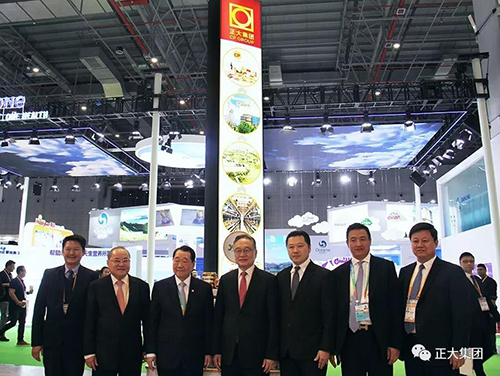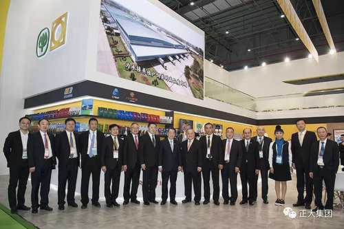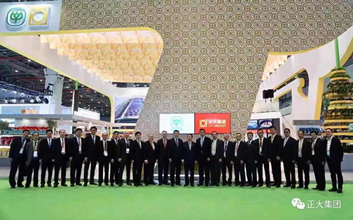 CPF聯席CEO陳澤翔同正大集團農牧食品企業中國區資深副董事長白善霖、於建平、霍爾峰、白宇飛、周永順、段佩財在正大展館前合影。